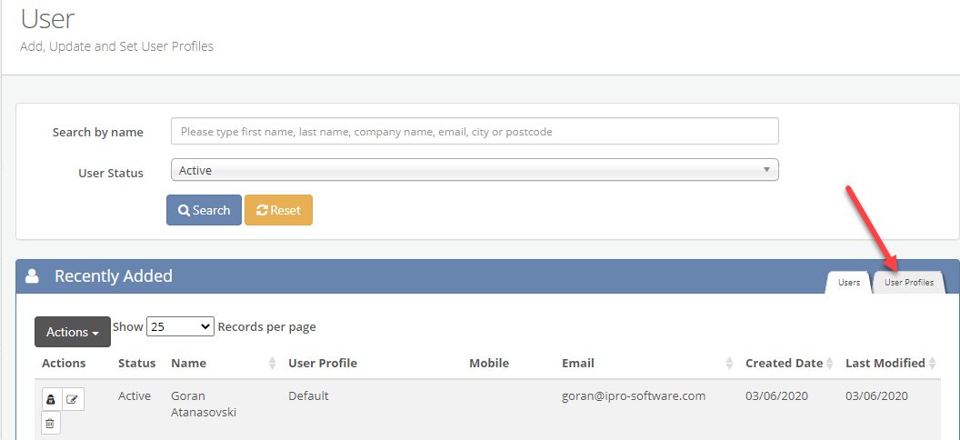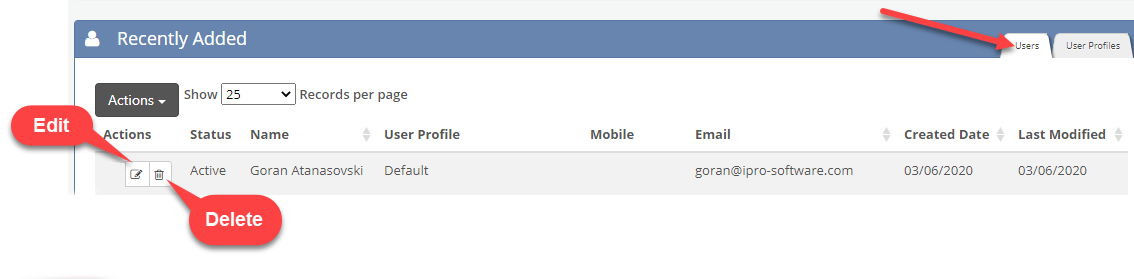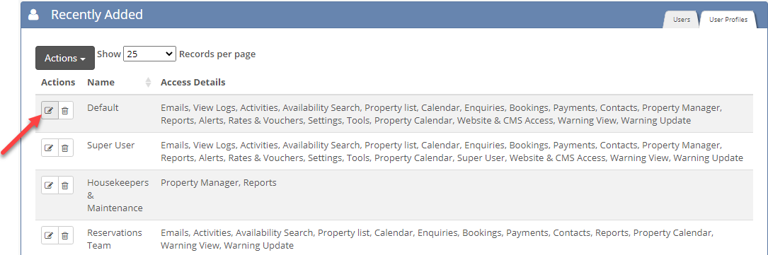 3/ A list of 'User Profiles' available on your account will be displayed. To edit a user profile, click the edit icon under the Actions Menu. To delete a user profile, just click the delete icon beside it.