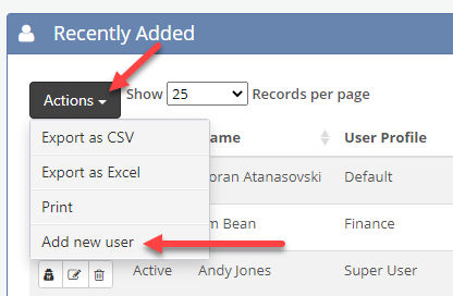 2/ To create a new user account, click on the 'Actions' button and select 'Add new user':