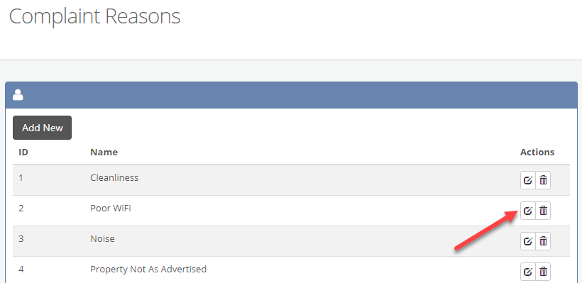 2/ This will bring you to the Complaint Reasons dashboard which will list down all the current complaint reasons on your account that is available for use. You can edit or delete complaint reasons here by clicking on the appropriate icon under the Actions column:
