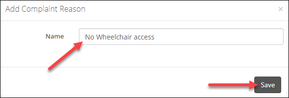 4/ The Add Complaint Reason window will pop-up and simply input the value in the Name field and click 'Save':