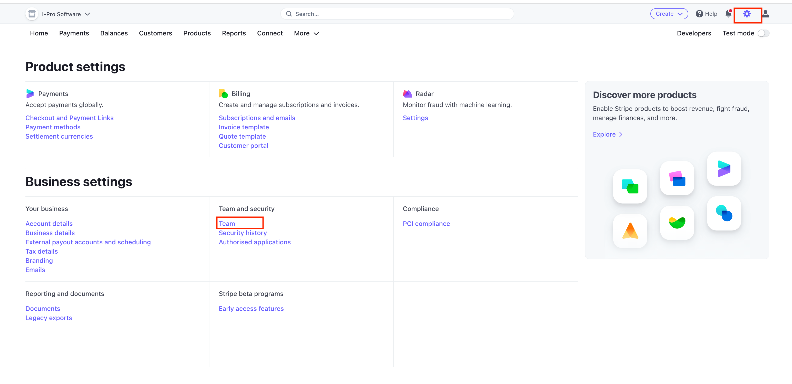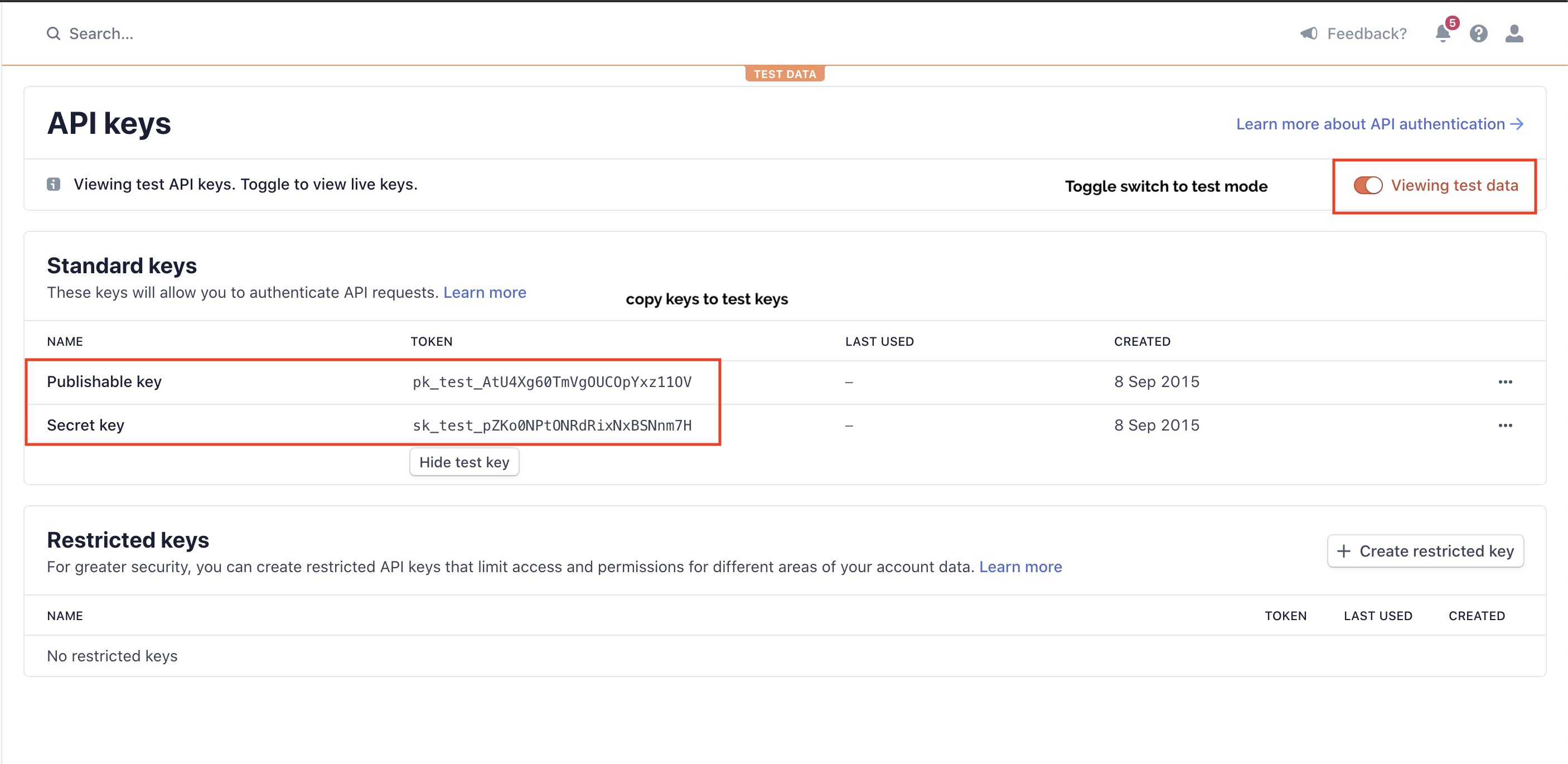 4) Toggle Stripe into 'View Test Data', and then copy those keys into iPro